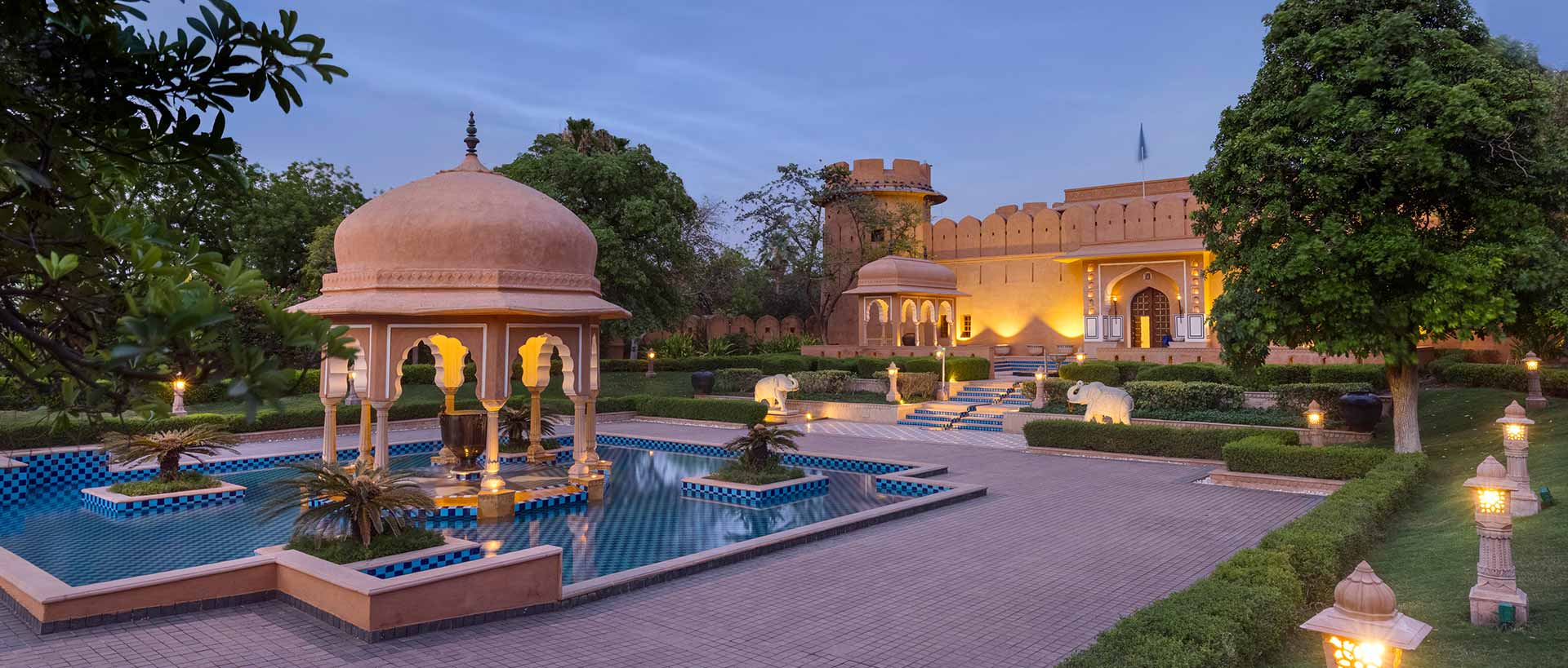 The Oberoi Rajvilas, Jaipur. A royal resort amidst the timeless charm of the Pink City, recreating the magnificence of princely Rajasthan in a beautiful fort setting with lush gardens and reflection pools.