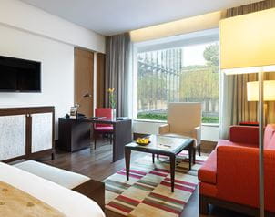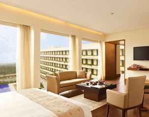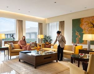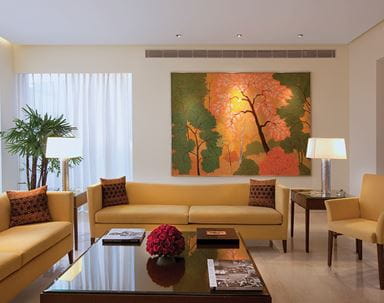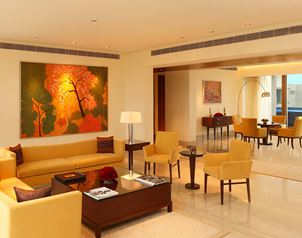 Fit for royalty, every inch of this vast suite with 334 square metres interiors, has been designed with your utmost comfort in mind. Natural light flows through the master bedroom and adjoining twin room, the private dressing room, comfortable living and dining areas, private study and pantry. And for your relaxation, there is a heated outdoor pool and a terrace with views of the Gurgaon skyline. Eclectic modern artworks abound adding a touch of class.