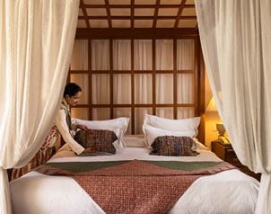 With a temperature-controlled private pool and an outdoor dining area , our Premier Room with Private Pool offers a luxurious retreat. Nestled within a private garden, these accommodation provides an exquisite setting. The air-conditioned 42 square metre interiors with a four-poster bed and an en-suite bathroom with a sunken marble bathtub, make for an excellent change of scene.