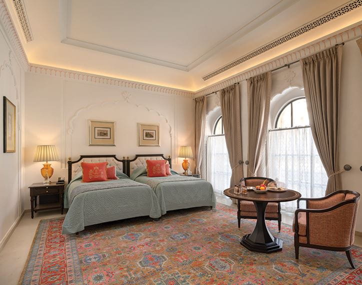 Featuring traditional limestone interior architecture, these palatial rooms in Khajuraho enjoy waterbody views and are filled with natural light through clerestory windows.