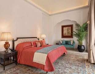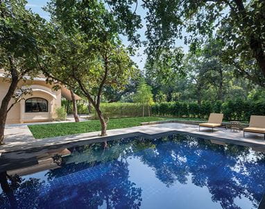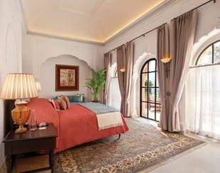 With 120 square metres of interiors, the suites include a master bedroom and a separate sitting area, an ensuite bathroom and a private courtyard with uninterrupted views of Panna National Park.
