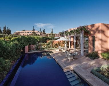 Tastefully decorated in a subtle palette of muted ivory and burnished gold. Featuring ornate Moroccan design elements, these rooms with 70 square metres interiors & 35 square metres exterior, include a large private terrace and luxurious bathroom with a separate vanity area . The rooms offer views of the snow-capped Atlas Mountains, citrus and olive orchards and the grand canal water feature that runs through the length of the resort.