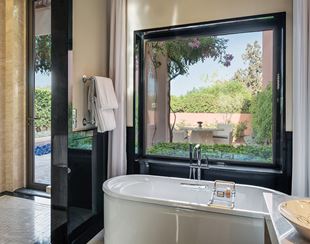 Bathed in sunlight throughout the day, these villas blend refined Moroccan craftsmanship with contemporary elegance. Their 72-square-metre interiors are adorned with hand-painted zellige tiles and intricately sculpted wall panels that unfold into a beautifully landscaped private courtyard, with a temperature-controlled pool for year-round enjoyment.