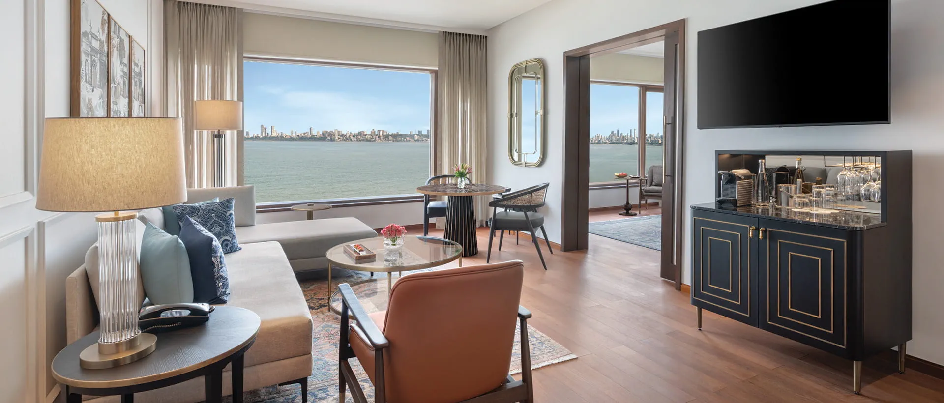 Bay View Residential Suite113 square metre interiors that include a master bedroom, a private study and an ensuite bathroom with a separate dressing area. The expansive living room, adorned with colourful modern art, presents stunning ocean views in picture-frame windows.