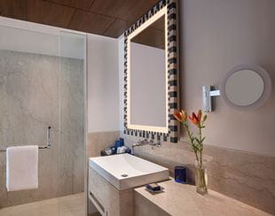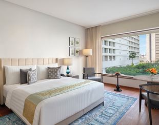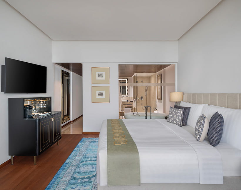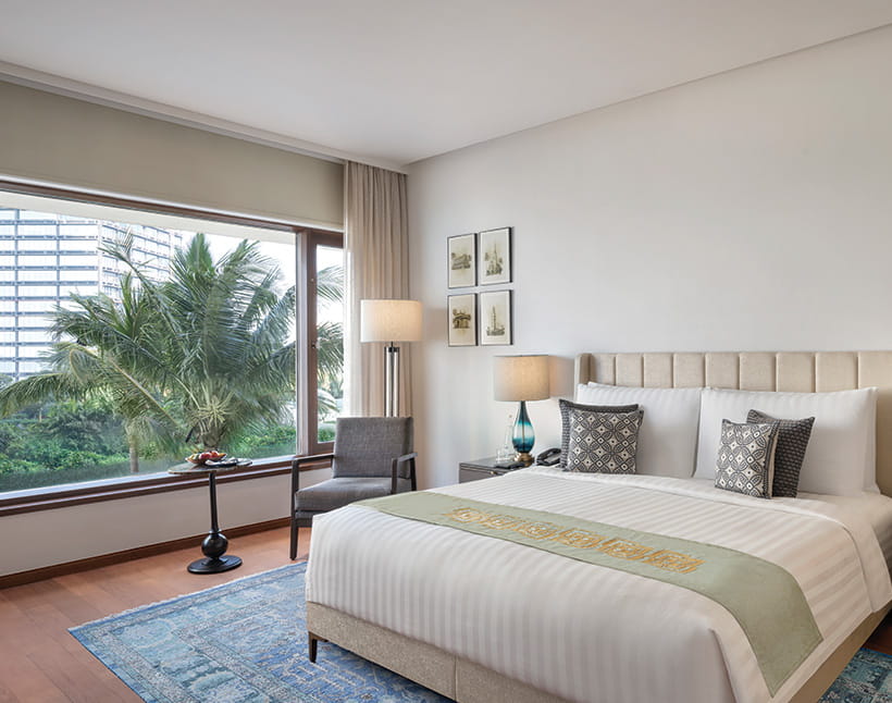 These newly refreshed rooms offer a bird’s-eye view of Mumbai’s skyline, dotted with modern and traditional architecture. The comfortable interiors include a king-size bed, a walk-in wardrobe, an armchair and a writing desk. The bathroom has a standalone bathtub and a separate shower to complete the experience.