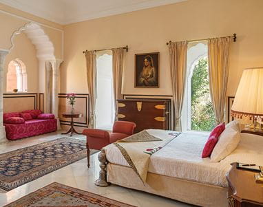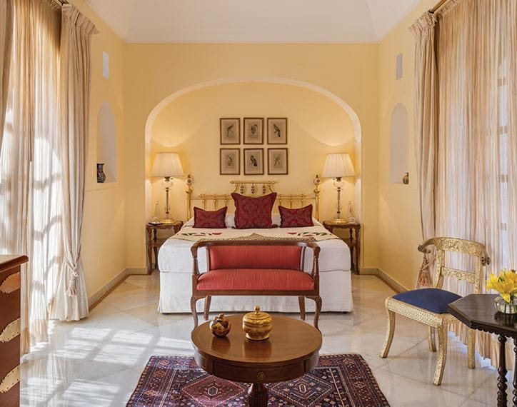 While glass doors, courtyard and garden views frame either side of this elegant accommodation, vintage artworks of local birdlife bring a refreshing natural energy to the interiors. Jharoka windows and Rajasthani fabrics complete the experience.