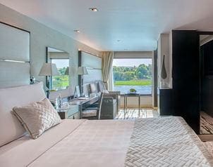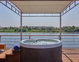 Thoughtfully designed for families or small groups, this expansive suite offers all the comforts of our Luxury Suite, with two spacious king size bedrooms. Interiors are bathed in natural light and decorated in a calming, neutral palette, with clean lines, plush furnishings and floor-to-ceiling windows that frame uninterrupted views of the River Nile. A separate living room and private dining space open onto a sun-drenched terrace, where you can relax on a lounger or unwind in your private heated outdoor whirlpool. The naturally lit bathroom features a standalone bathtub and a glass-panelled rain shower perfect for easing into the evening after a day of exploration.