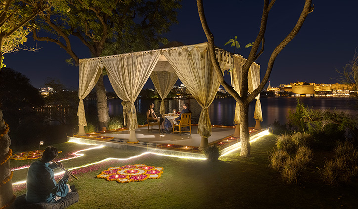 More than just a lake view restaurant in Udaipur, dinner at The Oberoi Udaivilas, Udaipur lakeside pavilion is an experience to share with someone special. A canopied table offers the finest views of starlit Lake Pichola and the softly lit façade of City Palace, for an evening as timeless as the setting itself.