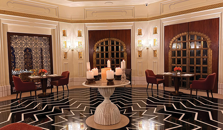 Open from noon to midnight, The Bar at The Oberoi Udaivilas is a charming setting to enjoy cocktails and mocktails. A patchwork of tables nestles under traditional archways and domes, with uninterrupted views of the resort’s lush gardens and Lake Pichola beyond.
