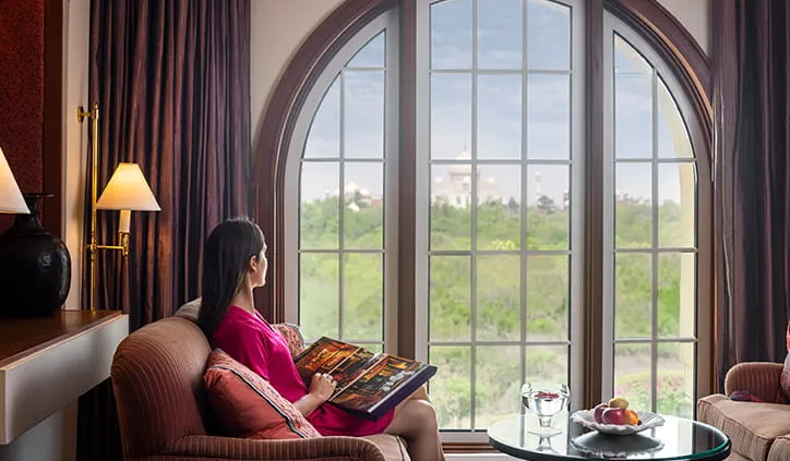 Book a Luxury Suite and bask in unrestricted Taj Mahal views from the unique octagonal glass-panelled rain shower, standalone bathtub and private sun terrace attached to the bathroom.