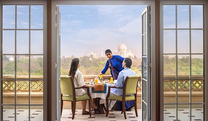 Book a room or suite with a private balcony and experience a romantic dinner for two with views of the Taj Mahal silhouetted against the night sky. A Royal Indian Thali provides an authentic taste of this timeless destination.